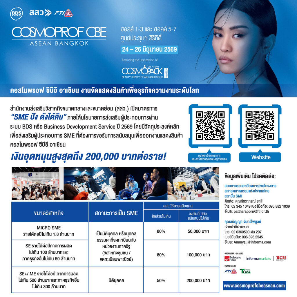 โอกาสพิเศษ! สำหรับผู้ประกอบการ SME ที่สนใจร่วมออกแสดงสินค้ากับ คอสโมพรอฟ ซีบีอี อาเซียน งานแสดงสินค้าเพื่อธุรกิจความงาม และสุขภาพที่ใหญ่ที่สุดในระดับอาเซียน จะจัดขึ้นระหว่างวันที่ 24 – 26 มิถุนายน 2569 ณ ศูนย์การประชุมแห่งชาติสิริกิติ์ ท่านสามารถเข้าร่วมโครงการ “SME ปัง ตังได้คืน” ภายใต้โครงการส่งเสริมผู้ประกอบการผ่านระบบ BDS หรือ Business Development Service ปี 2569 ของสำนักงานส่งเสริมวิสาหกิจขนาดกลางและขนาดย่อม (สสว.) ได้แล้ววันนี้ พร้อมรับเงินสนับสนุนค่าพื้นที่กว่า 80% มูลค่าสูงสุด 200,000 บาท ต่อราย!